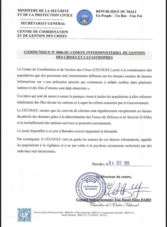 Accueil Fama Kibaru Carburant : Le Stock disponible à ce jour à Bamako couvre largement... Fama Kibaru Carburant : Le Stock disponible à ce jour à Bamako couvre largement la demande Par admin - 4 décembre 2025 28 0 Partager FacebookTwitterWhatsAppLinkedinTelegramCopy URL ARTICLES CONNEXESPLUS DE L'AUTEUR Fama Kibaru L’Etat-Major Général des Armées Informe l’opinion Nationale Fama Kibaru Mission de sécurisation : le Secteur 3 intensifie ses opérations Fama Kibaru FIN DE FORMATION POUR LE CONTINGENT 2023 LAISSER UN COMMENTAIRE Annuler la réponse S'il vous plaît entrez votre commentaire! S'il vous plaît entrez votre nom ici Vous avez entré une adresse email incorrecte! Veuillez entrer votre adresse email ici Enregistrer mon nom, email et site web dans ce navigateur pour la prochaine fois que je commenterai. 0FansJ'aime0SuiveursSuivre22,800AbonnésS'abonnerDon't Miss Finances publiques : La Cour suprême lève le voile sur 20 ans de subventions... Politique admin - 10 janvier 2026 Mali, la maison du charlatan Karamoko Sinayoko bloquée, des lacrymogènes dispersés Faits divers admin - 10 janvier 2026 Des attestations pour Assimi Goïta et Abdoul Kassim Fomba Politique admin - 18 décembre 2025 Burkina : l’avion nigérian et son équipage libérés (officiel) Politique admin - 18 décembre 2025 Voir plus