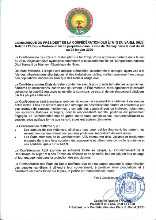 Accueil Politique COMMUNIQUÉ CONFÉDÉRATION AES SUR L’ATTAQUE DE NIAMEY Politique COMMUNIQUÉ CONFÉDÉRATION AES SUR L’ATTAQUE DE NIAMEY Par admin - 2 février 2026 24 0 Partager FacebookTwitterWhatsAppLinkedinTelegramCopy URL Source/Présidence de la République du Mali ARTICLES CONNEXESPLUS DE L'AUTEUR Politique Le Président de la Transition reçoit le pool d’avocats Politique L’AES : L’étincelle du Sahel qui défie l’obscurité Politique Avec la mort de Khamenei, Poutine perd encore un allié d’envergure LAISSER UN COMMENTAIRE Annuler la réponse S'il vous plaît entrez votre commentaire! S'il vous plaît entrez votre nom ici Vous avez entré une adresse email incorrecte! Veuillez entrer votre adresse email ici Enregistrer mon nom, email et site web dans ce navigateur pour la prochaine fois que je commenterai. 0FansJ'aime0SuiveursSuivre22,800AbonnésS'abonnerDon't Miss « Aveugle, inconsciente et irresponsable »: Dominique de Villepin condamne la réaction d’Emmanuel Macron à l’opération... Politique admin - 5 janvier 2026 KIDAL : Toute la ville unie pour le déblayage et l’entretien de la piste... Fama Kibaru admin - 14 février 2026 Alerte Météo : Épais brouillard de poussière sur Bamako ce lundi Faits divers admin - 16 février 2026 Burkina : une production record de 94 tonnes d’or en 2025 Economie admin - 3 février 2026 Voir plus