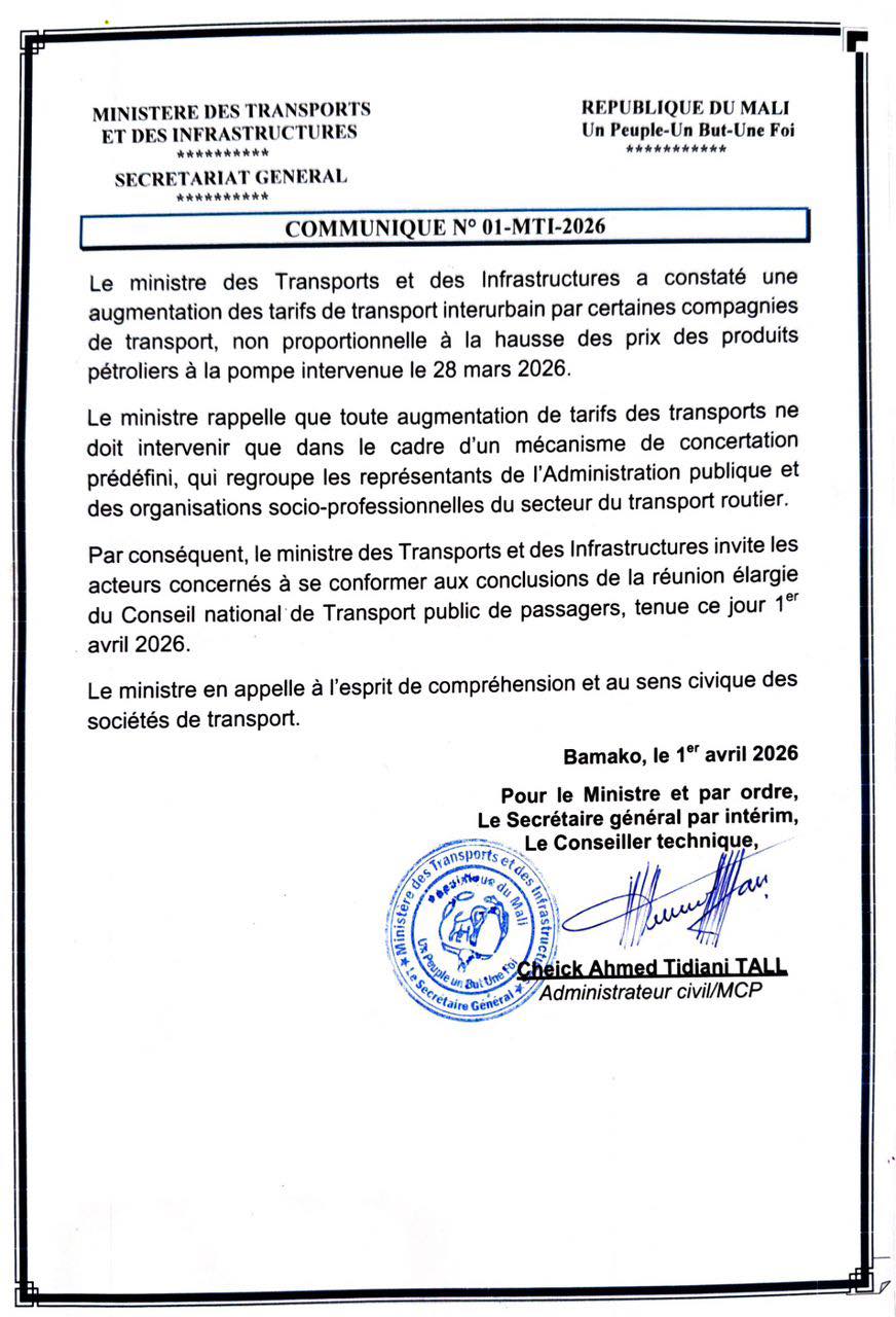 Accueil Economie Communiqué n°01 du ministère desTransports et des Infrastructures Economie Communiqué n°01 du ministère desTransports et des Infrastructures Par admin - 1 avril 2026 47 0 Partager FacebookTwitterWhatsAppLinkedinTelegramCopy URL Bamako, le 1er Avril 2026 Relatif à l’augmentation des tarifs de transport interurbain par certaines compagnies de transport https://cdmofficiel.com/wp-content/uploads/2026/03/operation1.gif ARTICLES CONNEXESPLUS DE L'AUTEUR Economie Sénégal : les exportations en hausse de 7,8% en janvier 2026 (ANSD) Economie Hydrocarbures : l’État renforce l’approvisionnement et sévit contre le marché noir Economie Economie : la Côte d’Ivoire supprime le visa douanier pour les marchandises vers le Mali et le Burkina Faso LAISSER UN COMMENTAIRE Annuler la réponse S'il vous plaît entrez votre commentaire! S'il vous plaît entrez votre nom ici Vous avez entré une adresse email incorrecte! Veuillez entrer votre adresse email ici Enregistrer mon nom, email et site web dans ce navigateur pour la prochaine fois que je commenterai. 0FansJ'aime0SuiveursSuivre22,900AbonnésS'abonnerDon't Miss Journée des femmes : déplacement stratégique du Premier ministre à Bandiagara Politique admin - 10 mars 2026 Le Real Madrid fait une énorme fleur à Xabi Alonso Sport admin - 15 décembre 2025 RPPM – OPÉRATION MALI ɲƐDAKURA CDM Actu admin - 5 mars 2026 SPÉCIAL 20 JANVIER CDM Actu admin - 20 janvier 2026 Voir plus