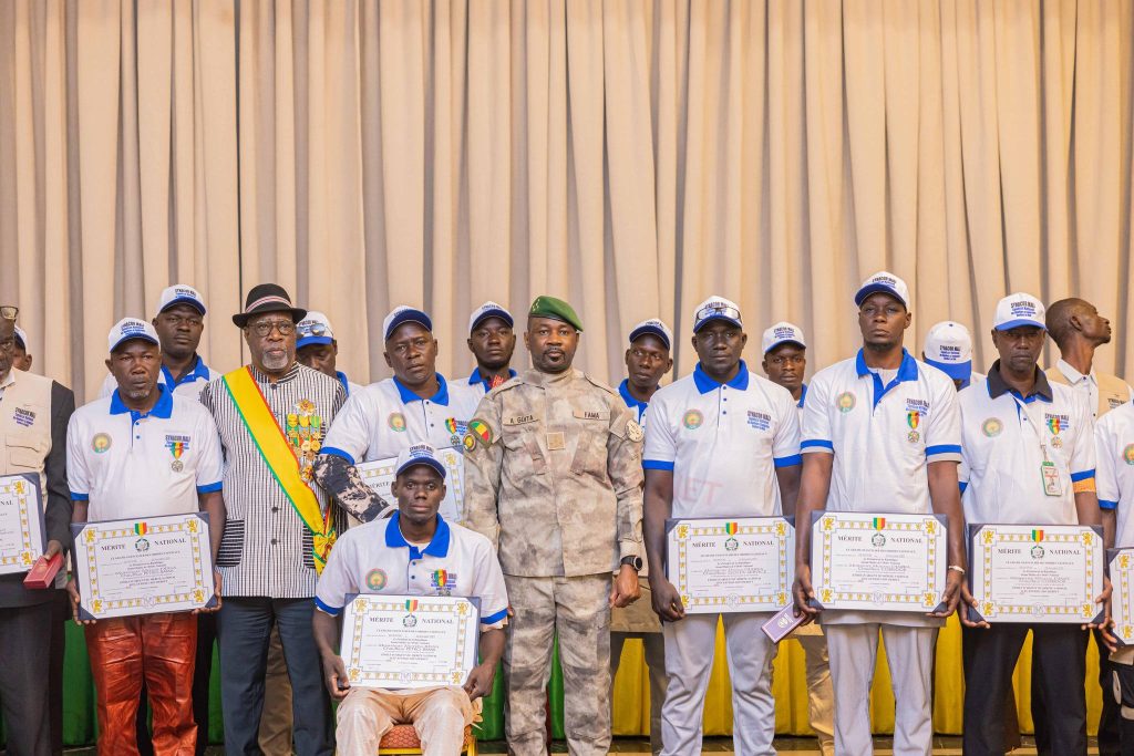 La cérémonie a ensuite été marquée par la remise des distinctions honorifiques par le chef de l’État, Grand maître des Ordres nationaux, aux récipiendaires, parmi lesquels des étrangers. Près d’une vingtaine d’opérateurs pétroliers ont été faits Chevaliers de l’Ordre national du Mali, tandis que des chauffeurs blessés ont reçu la médaille du Mérite national avec étoile d’argent et effigie « Lion Debout ». Des distinctions à titre posthume ont également été décernées aux chauffeurs décédés durant les opérations d’approvisionnement, en hommage à leur dévouement et à leur contribution à la stabilité du pays.