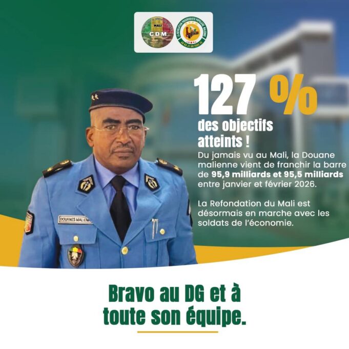 Accueil Economie Du jamais vu au Mali : 127 % des objectifs atteints ! Economie Du jamais vu au Mali : 127 % des objectifs atteints ! Par admin - 18 mars 2026 14 0 Partager FacebookTwitterWhatsAppLinkedinTelegramCopy URL La Douane malienne vient de franchir la barre de 95,9 milliards et 95,5 milliards entre janvier et février 2026. La Refondation du Mali est désormais en marche avec les soldats de l’économie. Bravo au DG et à toute son équipe. ARTICLES CONNEXESPLUS DE L'AUTEUR Economie 300 tonnes d’or non déclaré : le Mali se dote d’un nouvel outil ciblant l’orpaillage Economie La flambée du kérosène fait bondir les billets d’avion en Afrique Economie Le CECOGEC se dit surpris par la ruée soudaine des populations vers les stations-service LAISSER UN COMMENTAIRE Annuler la réponse S'il vous plaît entrez votre commentaire! S'il vous plaît entrez votre nom ici Vous avez entré une adresse email incorrecte! Veuillez entrer votre adresse email ici Enregistrer mon nom, email et site web dans ce navigateur pour la prochaine fois que je commenterai. 0FansJ'aime0SuiveursSuivre22,900AbonnésS'abonnerDon't Miss Primature : Le style Abdoulaye en sept piliers Politique admin - 24 novembre 2025 Mali-Guinée : À Conakry, le Général Assimi GOÏTA célèbre « deux poumons dans un... Politique admin - 19 janvier 2026 Trump accuse de “trahison” les médias qui questionnent sa santé Faits divers admin - 10 décembre 2025 Affaire « Ras Bath » : Le dossier renvoyé devant la Cour d’Assises Non classé admin - 16 décembre 2025 Voir plus
