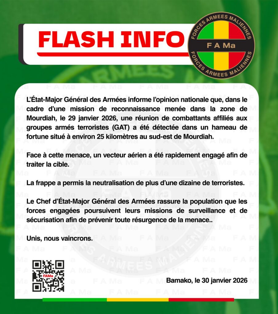 Accueil Fama Kibaru #FLASH INFO L’Etat-Major Général des Armées informe l’opinion nationale Fama Kibaru #FLASH INFO L’Etat-Major Général des Armées informe l’opinion nationale Par admin - 30 janvier 2026 32 0 Partager FacebookTwitterWhatsAppLinkedinTelegramCopy URL Source/FAMa.ml ARTICLES CONNEXESPLUS DE L'AUTEUR Fama Kibaru POLICE NATIONALE DU MALI Fama Kibaru L’Etat-Major Général des Armées informe l’opinion nationale Fama Kibaru GAO : le jardin d’enfants « La couronne de Sonny » LAISSER UN COMMENTAIRE Annuler la réponse S'il vous plaît entrez votre commentaire! S'il vous plaît entrez votre nom ici Vous avez entré une adresse email incorrecte! Veuillez entrer votre adresse email ici Enregistrer mon nom, email et site web dans ce navigateur pour la prochaine fois que je commenterai. 0FansJ'aime0SuiveursSuivre22,800AbonnésS'abonnerDon't Miss FAUSSES INFORMATIONS Fama Kibaru admin - 17 janvier 2026 Avec la mort de Khamenei, Poutine perd encore un allié d’envergure Politique admin - 2 mars 2026 Approvisionnement correct du Pays en hydrocarbure Economie admin - 16 janvier 2026 Kenieba : La Mairie met en garde contre les installations anarchiques alors que les... Economie admin - 25 novembre 2025 Voir plus
