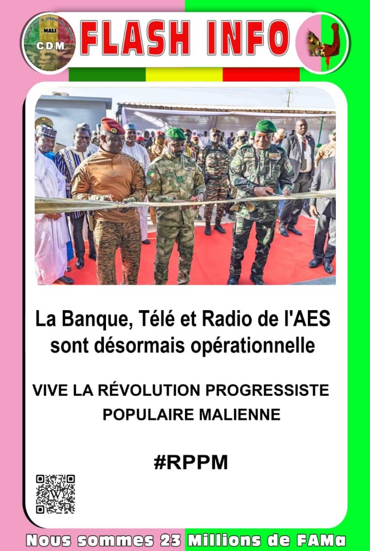 Accueil CDM Actu La Banque, Télé et Radio de l’AES sont désormais opérationnelle. CDM Actu La Banque, Télé et Radio de l’AES sont désormais opérationnelle. Par admin - 24 décembre 2025 23 0 Partager FacebookTwitterWhatsAppLinkedinTelegramCopy URL VIVE LA RÉVOLUTION PROGRESSISTE POPULAIRE MALIENNE #RPPM. ARTICLES CONNEXESPLUS DE L'AUTEUR CDM Actu FEMAFOOT ! CDM Actu CONCERT VIRTUEL A BAMAKO : le CDM rend hommage aux Forces Armées malienne CDM Actu SPÉCIAL 20 JANVIER LAISSER UN COMMENTAIRE Annuler la réponse S'il vous plaît entrez votre commentaire! S'il vous plaît entrez votre nom ici Vous avez entré une adresse email incorrecte! Veuillez entrer votre adresse email ici Enregistrer mon nom, email et site web dans ce navigateur pour la prochaine fois que je commenterai. 0FansJ'aime0SuiveursSuivre22,800AbonnésS'abonnerDon't Miss Nioro : Les FAMa libèrent un otage près de Gourel Hairé Fama Kibaru admin - 5 janvier 2026 2ᵉ COLLÈGE DES CHEFS D’ÉTAT DE LA CONFÉDÉRATION DES ÉTATS DU SAHEL (AES) :... Politique admin - 23 décembre 2025 Amélioration des services de santé Santé admin - 22 janvier 2026 Communique du Conseil des Ministres du vendredi 19 Décembre 2025 Politique admin - 20 décembre 2025 Voir plus