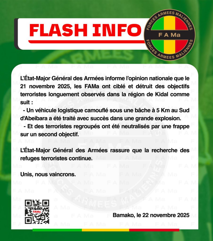 Accueil Fama Kibaru L’Etat-Major Général des Armées informe l’opinion nationale que le 21 novembre 2025,... Fama Kibaru L’Etat-Major Général des Armées informe l’opinion nationale que le 21 novembre 2025, les FAMa ont ciblé et détruit des objectifs terroristes longuement observés dans la région de Kidal. Par admin - 24 novembre 2025 64 0 Partager FacebookTwitterWhatsAppLinkedinTelegramCopy URL ARTICLES CONNEXESPLUS DE L'AUTEUR Fama Kibaru Mission de sécurisation : le Secteur 3 intensifie ses opérations Fama Kibaru FIN DE FORMATION POUR LE CONTINGENT 2023 CDM Actu CONCERT VIRTUEL A BAMAKO : le CDM rend hommage aux Forces Armées malienne LAISSER UN COMMENTAIRE Annuler la réponse S'il vous plaît entrez votre commentaire! S'il vous plaît entrez votre nom ici Vous avez entré une adresse email incorrecte! Veuillez entrer votre adresse email ici Enregistrer mon nom, email et site web dans ce navigateur pour la prochaine fois que je commenterai. 0FansJ'aime0SuiveursSuivre22,800AbonnésS'abonnerDon't Miss MONTÉE DES COULEURS NATIONALES A LA PRIMATURE Politique admin - 5 janvier 2026 Finances Publiques : Le Mali lance un nouveau programme d’apurement de la dette intérieure... Economie admin - 9 décembre 2025 Santé Publique : Plus d’une tonne de faux médicaments saisis à Dialakorobougou par l’OCS... Santé admin - 3 décembre 2025 Sécurité à Sikasso : Le 2e Arrondissement démantèle un duo de cambrioleurs armés Faits divers admin - 29 décembre 2025 Voir plus