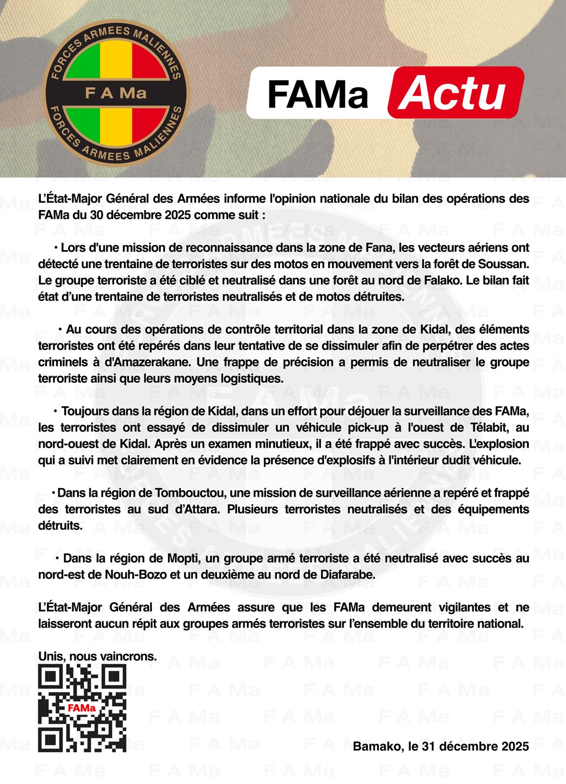 Accueil Fama Kibaru Le Chef d’Etat-Major General des Armées informe l’opinion nationale du bilan des... Fama Kibaru Le Chef d’Etat-Major General des Armées informe l’opinion nationale du bilan des opérations des FAMa du 30 décembre 2025 comme suite: Par admin - 31 décembre 2025 19 0 Partager FacebookTwitterWhatsAppLinkedinTelegramCopy URL Source / Forces Armées Maliennes ARTICLES CONNEXESPLUS DE L'AUTEUR Fama Kibaru L’Etat-Major Général des Armées Informe l’opinion Nationale Fama Kibaru Mission de sécurisation : le Secteur 3 intensifie ses opérations Fama Kibaru FIN DE FORMATION POUR LE CONTINGENT 2023 LAISSER UN COMMENTAIRE Annuler la réponse S'il vous plaît entrez votre commentaire! S'il vous plaît entrez votre nom ici Vous avez entré une adresse email incorrecte! Veuillez entrer votre adresse email ici Enregistrer mon nom, email et site web dans ce navigateur pour la prochaine fois que je commenterai. 0FansJ'aime0SuiveursSuivre22,800AbonnésS'abonnerDon't Miss Direction du Service Social des Armées (DSSA) : Journée récréative pour les enfants des... Fama Kibaru admin - 31 décembre 2025 2ᵉ COLLÈGE DES CHEFS D’ÉTAT DE LA CONFÉDÉRATION DES ÉTATS DU SAHEL (AES) :... Politique admin - 22 décembre 2025 Visite de courtoisie du nouvel Ambassadeur du Mali en Suisse au ministre de la... Politique admin - 8 janvier 2026 Distinctions nationales : Le président Assimi Goïta réaffirme la reconnaissance de la nation aux... Politique admin - 11 décembre 2025 Voir plus