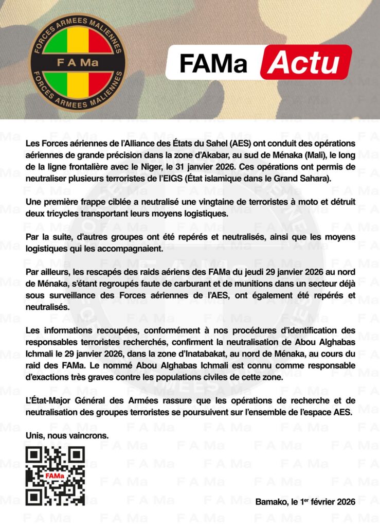 Accueil Fama Kibaru Les Forces aériennes de l’Alliance des Etats du Sahel (AES) … Fama Kibaru Les Forces aériennes de l’Alliance des Etats du Sahel (AES) … Par admin - 2 février 2026 23 0 Partager FacebookTwitterWhatsAppLinkedinTelegramCopy URL ont conduit des opérations aériennes de grande précision Source/FAMa.ml ARTICLES CONNEXESPLUS DE L'AUTEUR Fama Kibaru POLICE NATIONALE DU MALI Fama Kibaru L’Etat-Major Général des Armées informe l’opinion nationale Fama Kibaru GAO : le jardin d’enfants « La couronne de Sonny » LAISSER UN COMMENTAIRE Annuler la réponse S'il vous plaît entrez votre commentaire! S'il vous plaît entrez votre nom ici Vous avez entré une adresse email incorrecte! Veuillez entrer votre adresse email ici Enregistrer mon nom, email et site web dans ce navigateur pour la prochaine fois que je commenterai. 0FansJ'aime0SuiveursSuivre22,800AbonnésS'abonnerDon't Miss CEREMONIE DE DECORATION Politique admin - 7 février 2026 Burkina : plus de 8 000 explosifs saisis en cinq jours Faits divers admin - 10 janvier 2026 Sénégal : l’assemblage de véhicules militaires démarre Faits divers admin - 15 décembre 2025 Assimi Goïta face à «TOUT» : Souveraineté, guerre narrative et exigences de gouvernance Politique admin - 24 novembre 2025 Voir plus