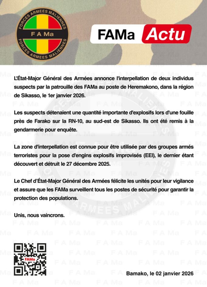 Accueil Fama Kibaru L’Etat-Major Général des Armées annonce l’interpellation de deux individus suspects par la... Fama Kibaru L’Etat-Major Général des Armées annonce l’interpellation de deux individus suspects par la patrouille des FAMa au poste de Heremakono, dans la région de Sikasso, le 1er Janvier 2026. Par admin - 2 janvier 2026 21 0 Partager FacebookTwitterWhatsAppLinkedinTelegramCopy URL Source /Forces Armées Maliennes ARTICLES CONNEXESPLUS DE L'AUTEUR Fama Kibaru L’Etat-Major Général des Armées Informe l’opinion Nationale Fama Kibaru Mission de sécurisation : le Secteur 3 intensifie ses opérations Fama Kibaru FIN DE FORMATION POUR LE CONTINGENT 2023 LAISSER UN COMMENTAIRE Annuler la réponse S'il vous plaît entrez votre commentaire! S'il vous plaît entrez votre nom ici Vous avez entré une adresse email incorrecte! Veuillez entrer votre adresse email ici Enregistrer mon nom, email et site web dans ce navigateur pour la prochaine fois que je commenterai. 0FansJ'aime0SuiveursSuivre22,800AbonnésS'abonnerDon't Miss Bamako/le 23 décembre 2025/ #CollègeAESBamako Politique admin - 24 décembre 2025 Justice Militaire : Le Tribunal de Bamako juge des affaires de désertion et de... Fama Kibaru admin - 16 décembre 2025 Ministère de la Justice et des Droits de l’Homme : Les preux chevaliers honorés... Politique admin - 15 décembre 2025 Venezuela La présidente par intérim Delcy Rodriguez, a démis de ses fonctions le général... Faits divers admin - 9 janvier 2026 Voir plus