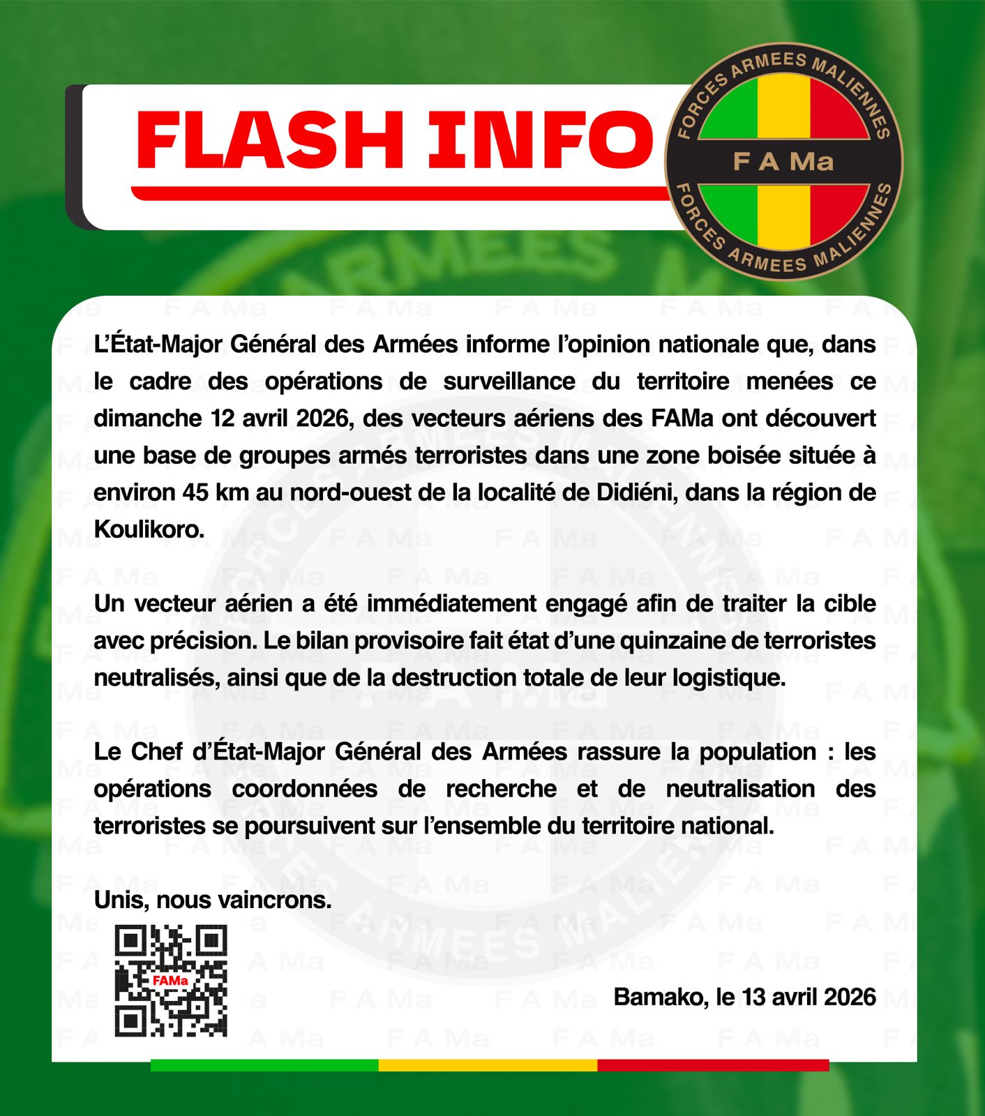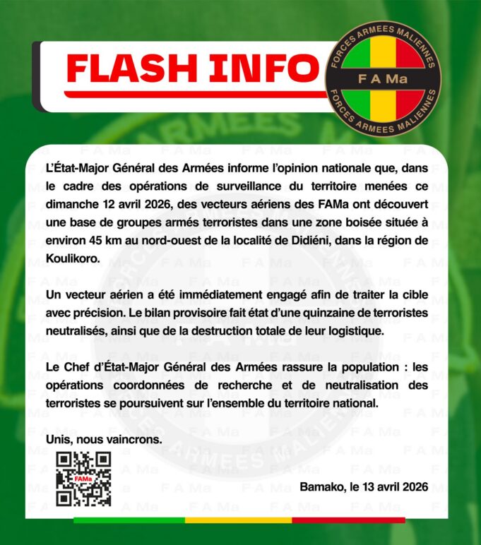 Accueil Fama Kibaru L’État-Major Géneral des Armées informe l’opinion nationale Fama Kibaru L’État-Major Géneral des Armées informe l’opinion nationale Par admin - 13 avril 2026 23 0 Partager FacebookTwitterWhatsAppLinkedinTelegramCopy URL Source/FAMa.ml https://cdmofficiel.com/wp-content/uploads/2026/03/operation1.gif ARTICLES CONNEXESPLUS DE L'AUTEUR Fama Kibaru REUNION DU COMITE DES CHEFS D’ETAT-MAJOR DE LA CONFEDERATION AES Fama Kibaru Secteur 7 de l’opération Dougoukoloko : Pas de rescapés Fama Kibaru Maillage sécuritaire : Le Général Sadio Camara pose la première pierre du nouveau camp militaire de Dioïla LAISSER UN COMMENTAIRE Annuler la réponse S'il vous plaît entrez votre commentaire! S'il vous plaît entrez votre nom ici Vous avez entré une adresse email incorrecte! Veuillez entrer votre adresse email ici Enregistrer mon nom, email et site web dans ce navigateur pour la prochaine fois que je commenterai. 0FansJ'aime0SuiveursSuivre22,900AbonnésS'abonnerDon't Miss Retour au pays : 150 Maliens rapatriés d’Algérie et de Tunisie accueillis avec dignité... Faits divers admin - 19 décembre 2025 Mali : Le CECOGEC dément toute pénurie d’essence et appelle au calme Politique admin - 13 mars 2026 Chronique : Quand la Sèbile remplace le Coran Faits divers admin - 2 février 2026 CAN TotalEnergies Maroc 2025 Sport admin - 29 décembre 2025 Voir plus
