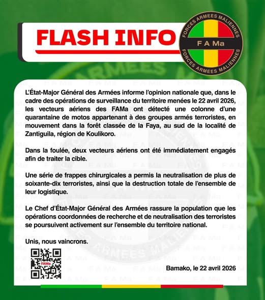 Accueil Fama Kibaru L’État-Major Général des Armées informe l’opinion nationale Fama Kibaru L’État-Major Général des Armées informe l’opinion nationale Par admin - 22 avril 2026 15 0 Partager FacebookTwitterWhatsAppLinkedinTelegramCopy URL Source/ FAMa.ml https://cdmofficiel.com/wp-content/uploads/2026/03/operation1.gif ARTICLES CONNEXESPLUS DE L'AUTEUR Fama Kibaru Mopti : Les FAMa neutralisent plus d’une soixantaine de terroristes près de Dioura Fama Kibaru Focus : Ohhh FAMa !!! Fama Kibaru Sikasso : les FAMa mènent une offensive d’envergure contre des groupes armés LAISSER UN COMMENTAIRE Annuler la réponse S'il vous plaît entrez votre commentaire! S'il vous plaît entrez votre nom ici Vous avez entré une adresse email incorrecte! Veuillez entrer votre adresse email ici Enregistrer mon nom, email et site web dans ce navigateur pour la prochaine fois que je commenterai. 0FansJ'aime0SuiveursSuivre22,900AbonnésS'abonnerDon't Miss Approvisionnement correct du Pays en hydrocarbure Economie admin - 16 janvier 2026 Santé publique : Alerte à la dengue et appel à la vigilance du Chef... Santé admin - 16 avril 2026 Biennale Artistique – Tombouctou 2025 : Le Ministre Mamou DAFFE dans la cité des... Faits divers admin - 2 décembre 2025 RÉGION MILITAIRE N°1 Fama Kibaru admin - 7 avril 2026 Voir plus