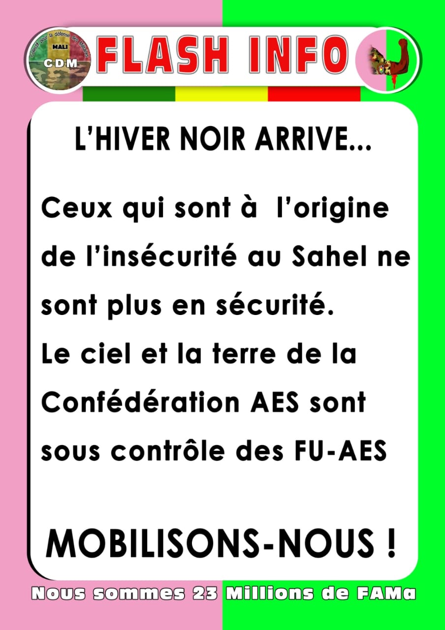 Accueil CDM Actu L’HIVER NOIR ARRIVE… CDM Actu L’HIVER NOIR ARRIVE… Par admin - 19 janvier 2026 7 0 Partager FacebookTwitterWhatsAppLinkedinTelegramCopy URL Cellule de communication Nous sommes 23 Millions de FAMa. ARTICLES CONNEXESPLUS DE L'AUTEUR CDM Actu FEMAFOOT ! CDM Actu CONCERT VIRTUEL A BAMAKO : le CDM rend hommage aux Forces Armées malienne CDM Actu SPÉCIAL 20 JANVIER LAISSER UN COMMENTAIRE Annuler la réponse S'il vous plaît entrez votre commentaire! S'il vous plaît entrez votre nom ici Vous avez entré une adresse email incorrecte! Veuillez entrer votre adresse email ici Enregistrer mon nom, email et site web dans ce navigateur pour la prochaine fois que je commenterai. 0FansJ'aime0SuiveursSuivre22,800AbonnésS'abonnerDon't Miss LES AIGLES DU MALI TOMBÉS LES ARMES EN MAIN! CDM Actu admin - 9 janvier 2026 Le Ministre Ismaël Wagué représente le Mali à la Conférence de Rabat sur les... Politique admin - 10 décembre 2025 Distinction honorifique de la « Médaille d’Honneur de l’Administration du Territoire » : Le... Politique admin - 16 décembre 2025 Célébration de la Journée Nationale de la Souveraineté retrouvée… Santé admin - 15 janvier 2026 Voir plus
