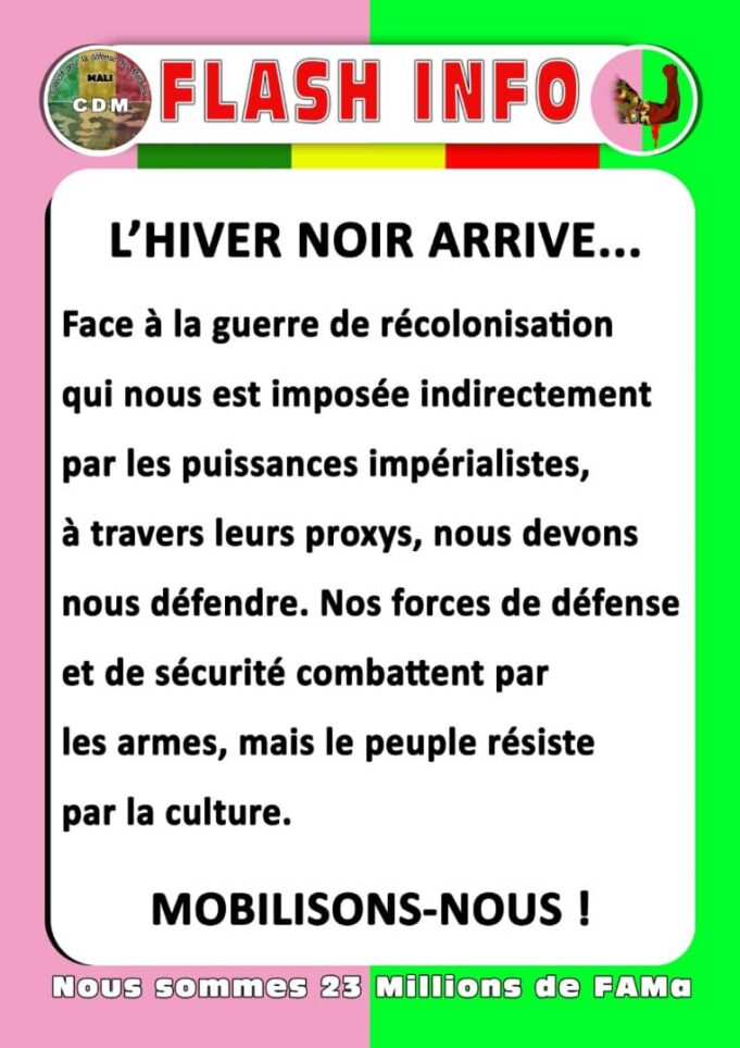 Accueil CDM Actu L’HIVER NOIR ARRIVE… CDM Actu L’HIVER NOIR ARRIVE… Par admin - 9 janvier 2026 51 0 Partager FacebookTwitterWhatsAppLinkedinTelegramCopy URL Nous Sommes 23 Millions de FAMa. Cellule de Communication – CDM ARTICLES CONNEXESPLUS DE L'AUTEUR CDM Actu Le Niger n’est ni membre de l’Union européenne ni soumis à son autorité CDM Actu COMMUNIQUÉ DE DÉNONCIATION ET DE CONDAMNATION DU CDM CDM Actu MOTION DE FÉLICITATIONS. LAISSER UN COMMENTAIRE Annuler la réponse S'il vous plaît entrez votre commentaire! S'il vous plaît entrez votre nom ici Vous avez entré une adresse email incorrecte! Veuillez entrer votre adresse email ici Enregistrer mon nom, email et site web dans ce navigateur pour la prochaine fois que je commenterai. 0FansJ'aime0SuiveursSuivre22,900AbonnésS'abonnerDon't Miss Nioro du Sahel-Kayes : Entre riposte militaire et persistance des menaces Politique admin - 9 février 2026 Le Festival de Friperie de Bamako est pour bientôt ! Faits divers admin - 10 janvier 2026 Lutte contre la corruption : Fini le bras long Politique admin - 11 février 2026 Développement économique Koulikoro inaugure son marché moderne.. Economie admin - 9 janvier 2026 Voir plus