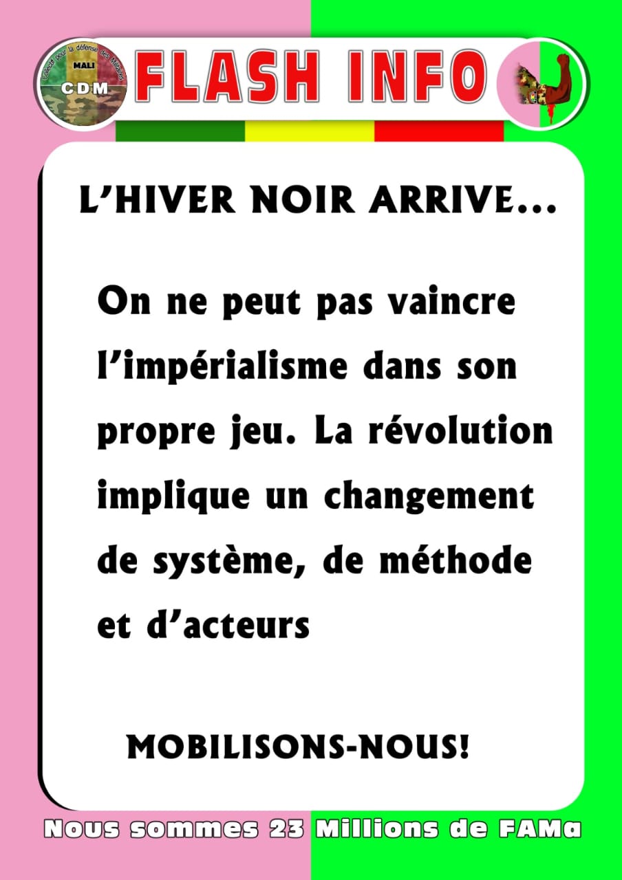 Accueil CDM Actu L’HIVER NOIR ARRIVE…On ne peut pas vaincre l’impérialisme dans son propre jeu. CDM Actu L’HIVER NOIR ARRIVE…On ne peut pas vaincre l’impérialisme dans son propre jeu. Par admin - 13 janvier 2026 10 0 Partager FacebookTwitterWhatsAppLinkedinTelegramCopy URL MOBILISONS-NOUS! Nous sommes 23 millions de FAMa. ARTICLES CONNEXESPLUS DE L'AUTEUR CDM Actu FEMAFOOT ! CDM Actu CONCERT VIRTUEL A BAMAKO : le CDM rend hommage aux Forces Armées malienne CDM Actu SPÉCIAL 20 JANVIER LAISSER UN COMMENTAIRE Annuler la réponse S'il vous plaît entrez votre commentaire! S'il vous plaît entrez votre nom ici Vous avez entré une adresse email incorrecte! Veuillez entrer votre adresse email ici Enregistrer mon nom, email et site web dans ce navigateur pour la prochaine fois que je commenterai. 0FansJ'aime0SuiveursSuivre22,800AbonnésS'abonnerDon't Miss Kati : les anciens combattants sensibilisés sur la Charte pour la paix et la... Fama Kibaru admin - 15 janvier 2026 Symbole de souveraineté nationale CDM Actu admin - 15 décembre 2025 L’HIVER NOIR ARRIVE… CDM Actu admin - 16 janvier 2026 RCI/législatives: des «irrégularités» à Marcory (pasteur Zahui) Politique admin - 2 janvier 2026 Voir plus