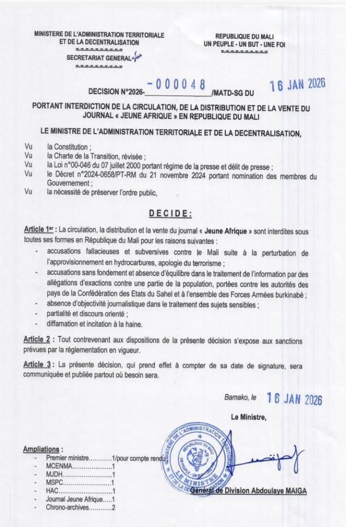 Accueil Politique Mali : le gouvernement interdit la circulation, la distribution et la vente... Politique Mali : le gouvernement interdit la circulation, la distribution et la vente du journal Jeune Afrique Par admin - 16 janvier 2026 11 0 Partager FacebookTwitterWhatsAppLinkedinTelegramCopy URL ARTICLES CONNEXESPLUS DE L'AUTEUR Politique Diplomatie : l’Ambassadeur de la République du Venezuela au Mali Politique Coopération Niger-Russie : Lancement de projets sociaux d’envergure à Tanda Politique Burkina: l’extradition de Damiba pour crimes financiers confirmée LAISSER UN COMMENTAIRE Annuler la réponse S'il vous plaît entrez votre commentaire! S'il vous plaît entrez votre nom ici Vous avez entré une adresse email incorrecte! Veuillez entrer votre adresse email ici Enregistrer mon nom, email et site web dans ce navigateur pour la prochaine fois que je commenterai. 0FansJ'aime0SuiveursSuivre22,800AbonnésS'abonnerDon't Miss MESSAGE DU CDM RELATIF A LA PRISE DE SERVICE DU NOUVEAU DIRECTEUR GÉNÉRAL DES... CDM Actu admin - 20 décembre 2025 Suppression totale du droit d’exercer le transport d’hydrocarbures… Economie admin - 12 janvier 2026 Le Gouverneur de Ségou prolonge le couvre-feu de 23h à 5h du matin. Fama Kibaru admin - 13 décembre 2025 BIEN DIT : Quand l’ingéniosité du mal se heurte à la culture du bien Fama Kibaru admin - 4 décembre 2025 Voir plus