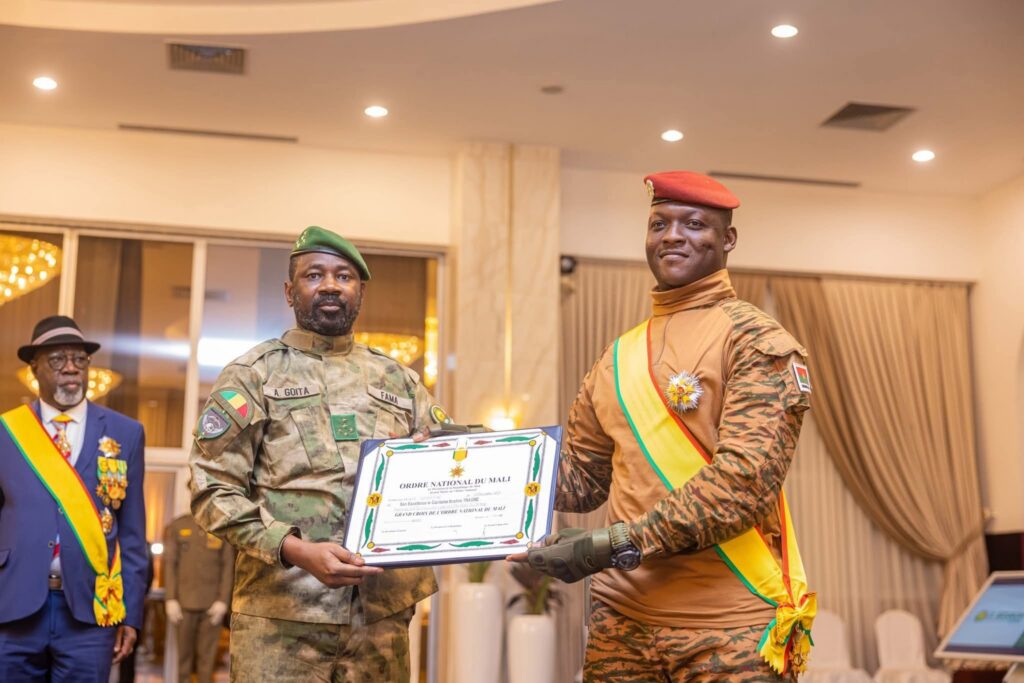 Le Président du Faso , Président de la Confédération des États du Sahel(AES),le Capitaine Ibrahim TRAORE a été élevé à la dignité de Grand-Croix de l’Ordre national du Mali par le Président du Mali, le Général d’Armée Assimi Goïta .