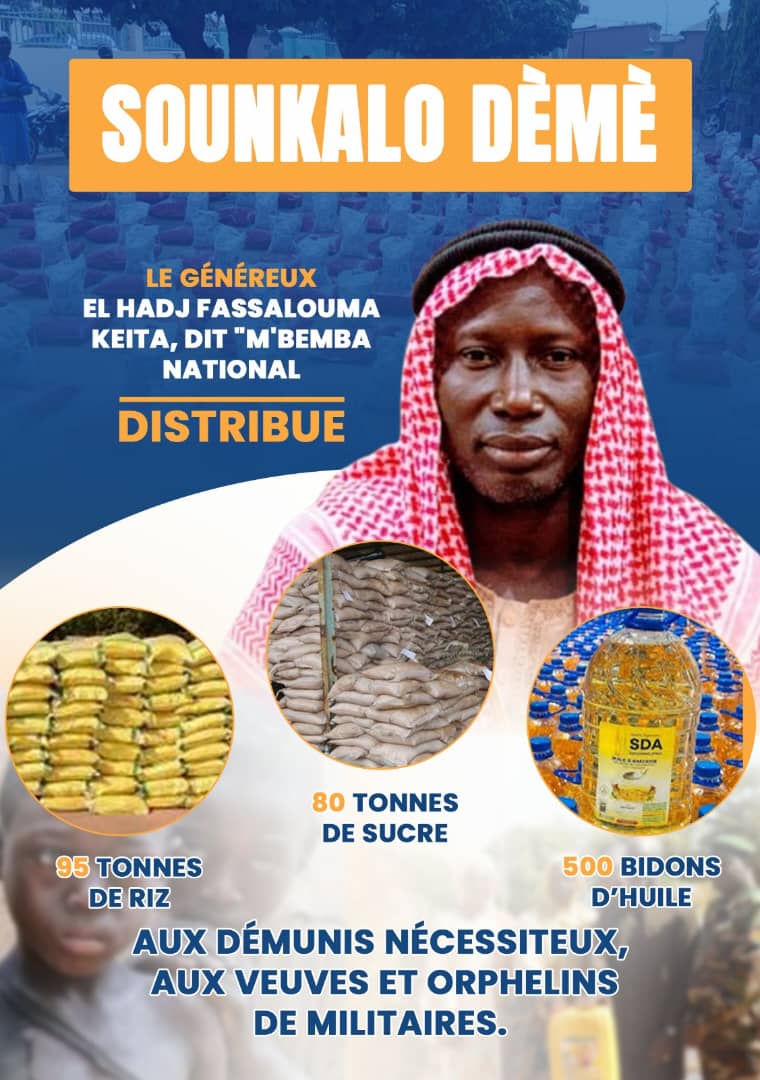 Accueil Non classé SOUNKALO DÈMÈ ! Non classé SOUNKALO DÈMÈ ! Par admin - 21 février 2026 35 0 Partager FacebookTwitterWhatsAppLinkedinTelegramCopy URL LE GÉNÉREUX EL HADJ FASSALOUMA KEITA, DIT « M’BEMBA NATIONAL », DISTRIBUE 95 TONNES DE RIZ, 80 TONNES DE SUCRE ET 500 BIDONS D’HUILE AUX DÉMUNIS NÉCESSITEUX, AUX VEUVES ET ORPHELINS DE MILITAIRES. ARTICLES CONNEXESPLUS DE L'AUTEUR Non classé Les États-Unis annoncent leurs premières victimes dans la guerre contre l’Iran Non classé Nécrologie : Le Mali et l’Afrique pleurent le Maestro Boncana Maïga Non classé Orange Mali VS Wave : Anatomie sémiotique d’une bataille numérique au Mali LAISSER UN COMMENTAIRE Annuler la réponse S'il vous plaît entrez votre commentaire! S'il vous plaît entrez votre nom ici Vous avez entré une adresse email incorrecte! Veuillez entrer votre adresse email ici Enregistrer mon nom, email et site web dans ce navigateur pour la prochaine fois que je commenterai. 0FansJ'aime0SuiveursSuivre22,800AbonnésS'abonnerDon't Miss Sommet de l’AES à Bamako : Ultime préparation pour le rendez-vous de décembre Politique admin - 8 décembre 2025 L’Office Central des Stupéfiants (OCS) : Le Bilan 2025 pulvérise Faits divers admin - 23 janvier 2026 CEREMONIE DE DECORATION Politique admin - 7 février 2026 CAN 2025 : place aux demi-finales, ce mercredi Sport admin - 14 janvier 2026 Voir plus