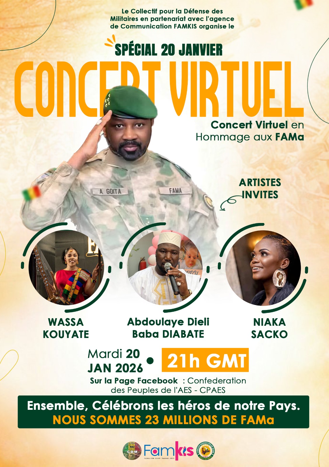 Le Collectif pour la Défense des Militaires (CDM), avec l’agence FAMKIS, organise ce soir, au siège du CDM à partir de 21 h, un concert virtuel patriotique en hommage à nos vaillantes FAMa, bouclier de la Nation.